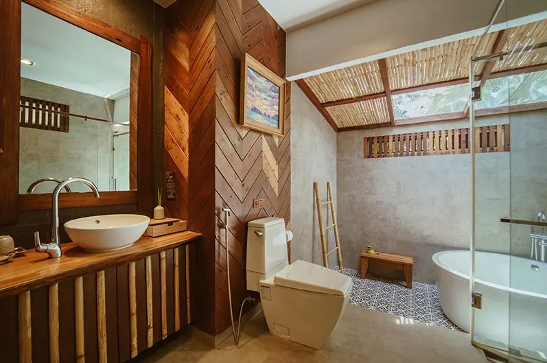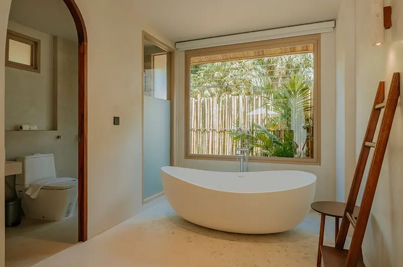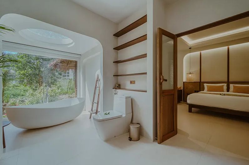 Коттедж включает 2 спальни с 1 двуспальной и 2 односпальными кроватями, 2 санузла с душем и ванну на открытом воздухе, мини-кухню с обеденной зоной, террасу с видом на сад. В числе удобств кондиционер, телевизор с приложением Netflix, кофемашина Nespresso, чайная станция, микроволновка, холодильник, халаты, тапочки, фен, косметика премиум-класса.